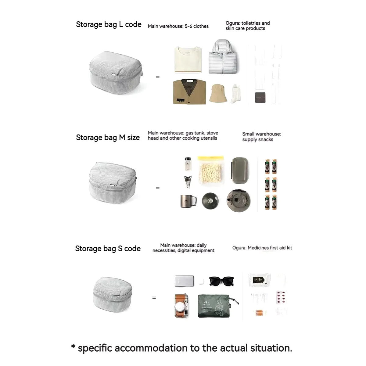 Naturehike Cloudpouch Organizador de Mochila 3 piezas El Cloudpouch de Naturehike es una forma práctica de levar tus objetos personales de forma práctica y organizada. Cuenta con tres piezas en distintos tamaños (S, M y L) cada una con dos compartimientos. Ideal para viajes y campamentos. Estas bolsas son resistentes al agua y pueden usarse para guardar ropa, cepillo de dientes, rasuradora, pasta dental, shampoo, gel de baño y otros productos de higiene. Características: • Incluye 3 piezas en tamaños S, M y L. Cada uno con 2 compartimientos. • Material de nailon de alta densidad que es duradero. • Puede lavarse a máquina. • Cuentan con un cordín para sacar fácilmente de la mochila. • Tela impermeable y liviana. • Cierre doble. Información técnica: • Material: 100% Nylon • Modelo: CNK2350XB011 • Tamaño : S: 23x16x12cm / M: 25,5x20x12cm / L: 32x23,5x12cm • Peso: S: 40 g / M: 46g / L : 55g / Total: 154 g