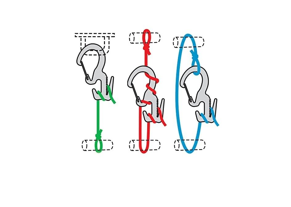 - Su diseño en forma de 9 te permite tensar cuerdas y lineas sin nudos o técnicas complicadas. Además, tiene el beneficio añadido de un mosquetón para una conexión rápida a un punto fijo.
