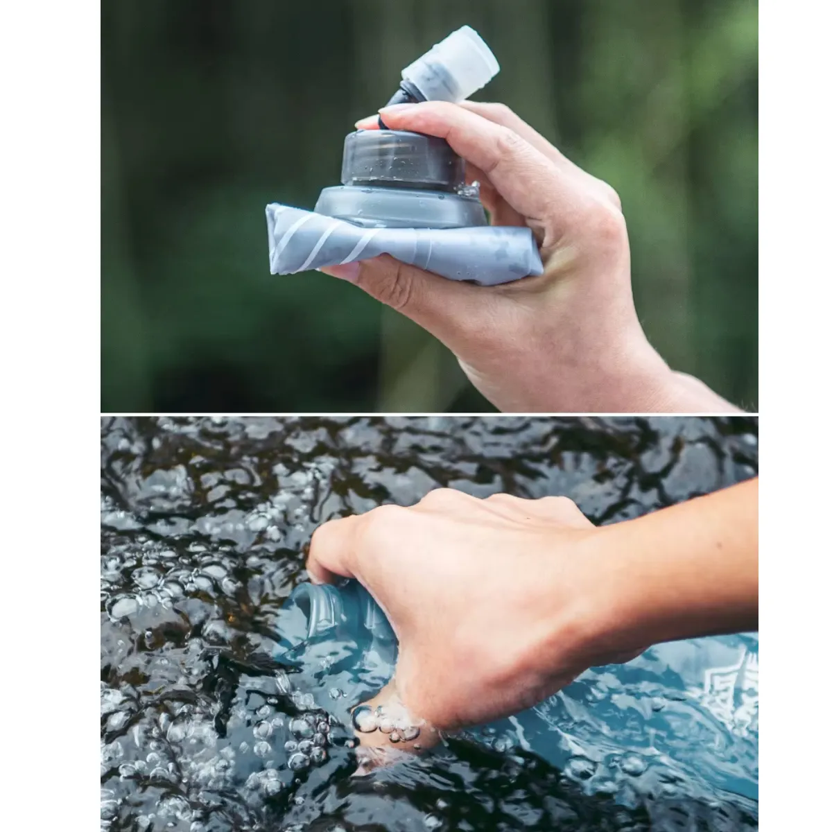 • Botella plegable: Su material suave se adapta a cualquier bolsillo y se encoge al beber para minimizar el movimiento y guardarse fácilmente cuando está vacía.